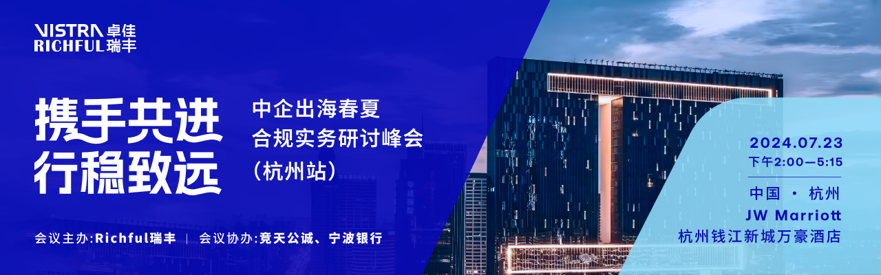 “攜手共進,行穩(wěn)致遠:中企出海春夏合規(guī)實務研討峰會”活動于今日7月23日下午在杭州錢江新城萬豪酒店成功舉辦。本次峰會由Richful瑞豐發(fā)起和主辦,聯(lián)合Vistra卓佳、競天公誠、寧波銀行協(xié)辦,吸引了近百位來自華東地區(qū)的企業(yè)高管報名參會。