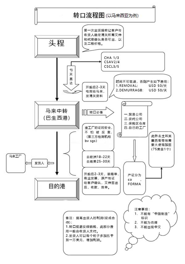 第一步:中國出口到馬來西亞(中國工廠在生產(chǎn)的時(shí)候產(chǎn)品和外包裝上面不能顯示MADE IN CHINA,不能有中文.也就是如果美國海關(guān)查柜不能看出產(chǎn)品跟中國有關(guān))