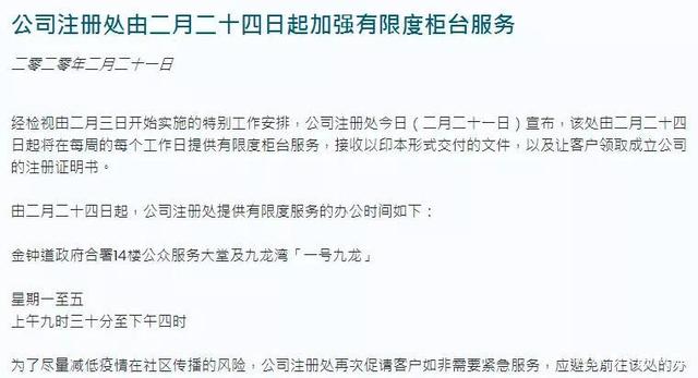香港公司注冊(cè)處發(fā)布新聞公報(bào)宣布,由2月24日起繼續(xù)提供有限度柜臺(tái)服務(wù);僅接受影印文件提交,及辦理客戶(hù)領(lǐng)取成立公司注冊(cè)證明書(shū) 。
