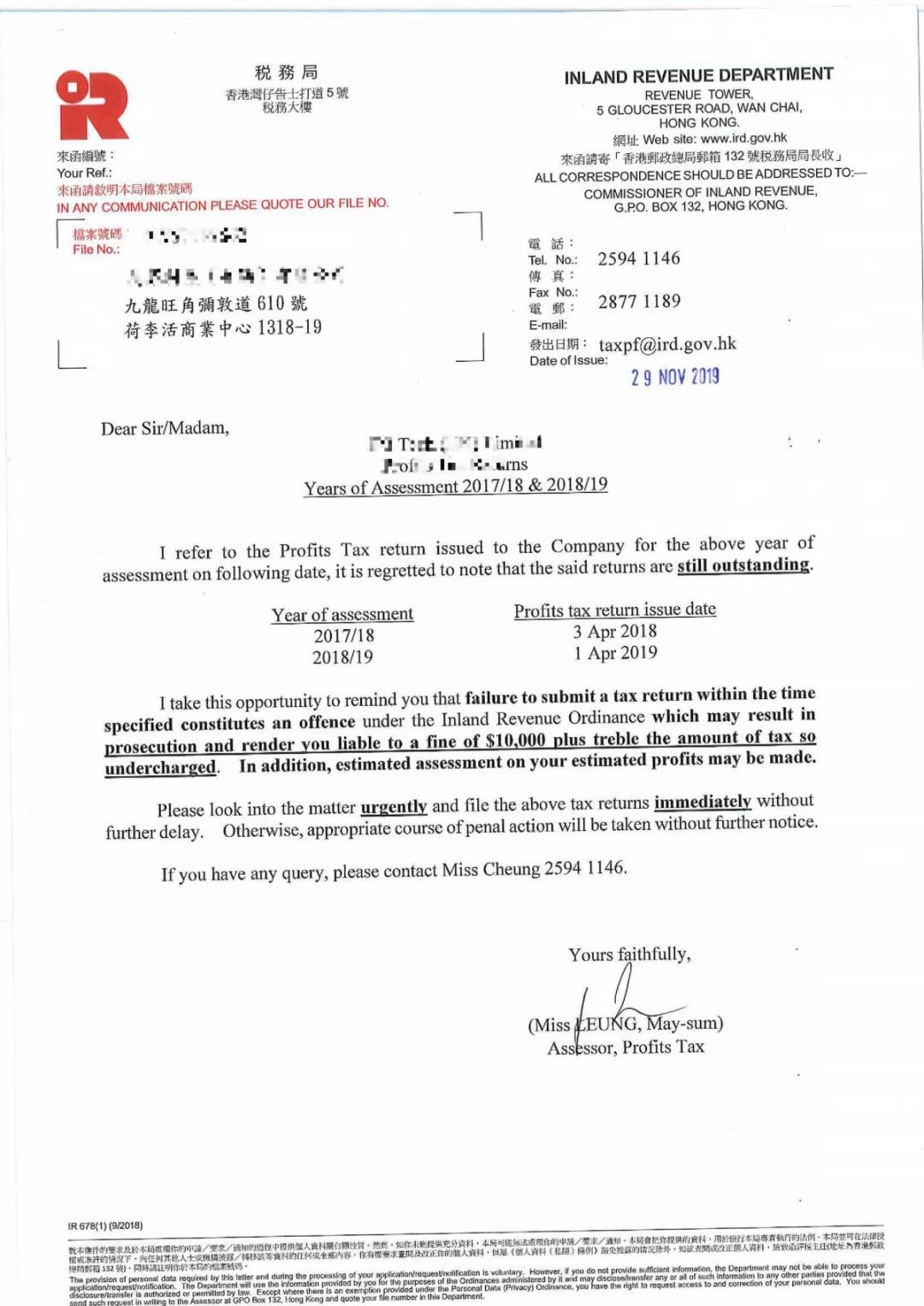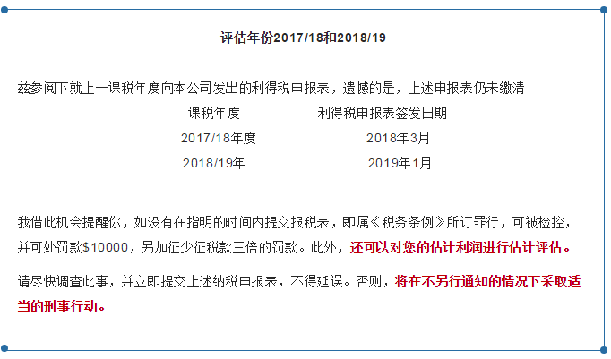 同時,截止12月尚未申報的公司,香港稅局也陸續(xù)開始下發(fā)通牒信函(如圖所示),公司將可能面臨高額罰款及評稅,且進行強制扣稅!