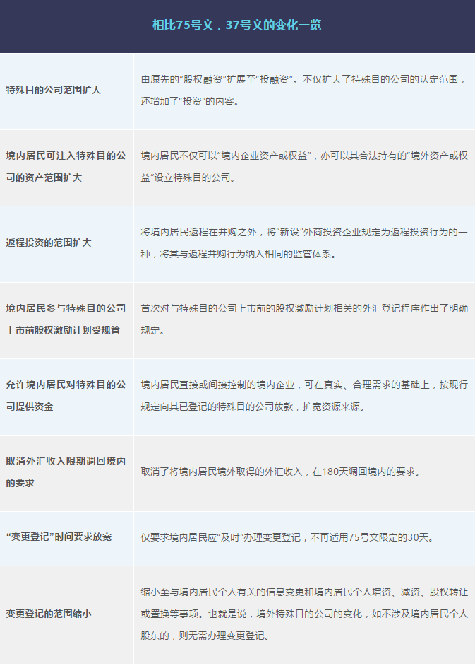 37號(hào)文在監(jiān)管范圍、特殊目的公司范圍、境內(nèi)居民境外投資、融資以及返程投資、股權(quán)激勵(lì)計(jì)劃登記、各項(xiàng)登記程序、處罰依據(jù)與措施等方面均進(jìn)行了較大調(diào)整。
