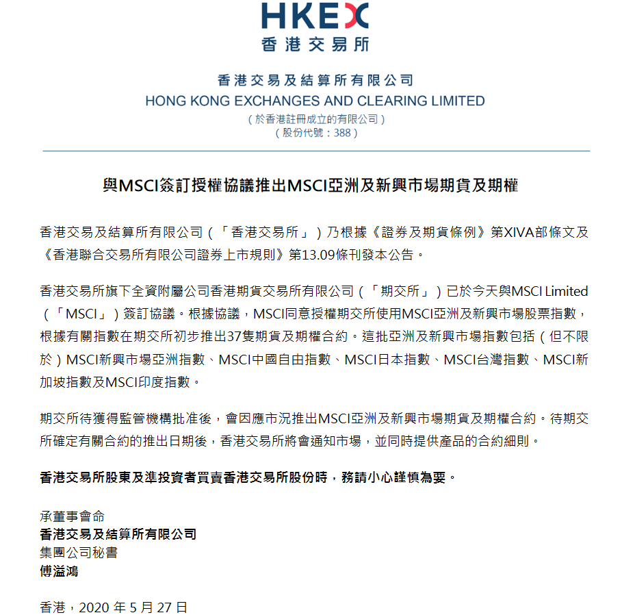 5月27日,港交所與MSCI簽訂協(xié)議,獲得未來(lái)10年授權(quán)在香港推出系列MSCI亞洲和新興市場(chǎng)指數(shù)的期貨及期權(quán)產(chǎn)品。根據(jù)協(xié)議,MSCI同意授權(quán)期交所使用MSCI亞洲及新興市場(chǎng)股票指數(shù),根據(jù)有關(guān)指數(shù)在期交所初步推出37只期貨及期權(quán)合約。