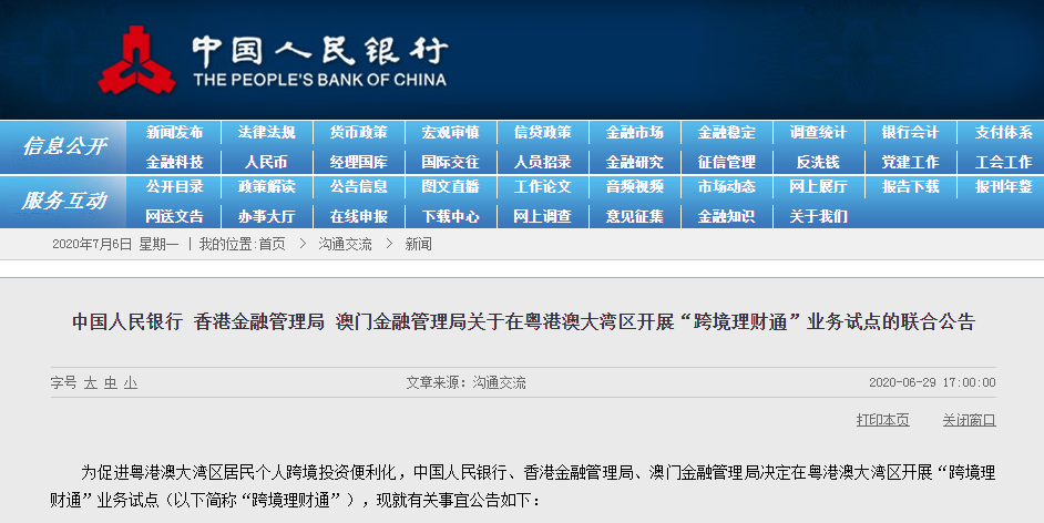 6月29日,市場翹首等待已久的“跨境理財通”終于出爐!根據(jù)官方發(fā)布消息,為促進粵港澳大灣區(qū)居民個人跨境投資便利化,中國人民銀行、香港金融管理局、澳門金融管理局決定在粵港澳大灣區(qū)開展“跨境理財通”業(yè)務試點。