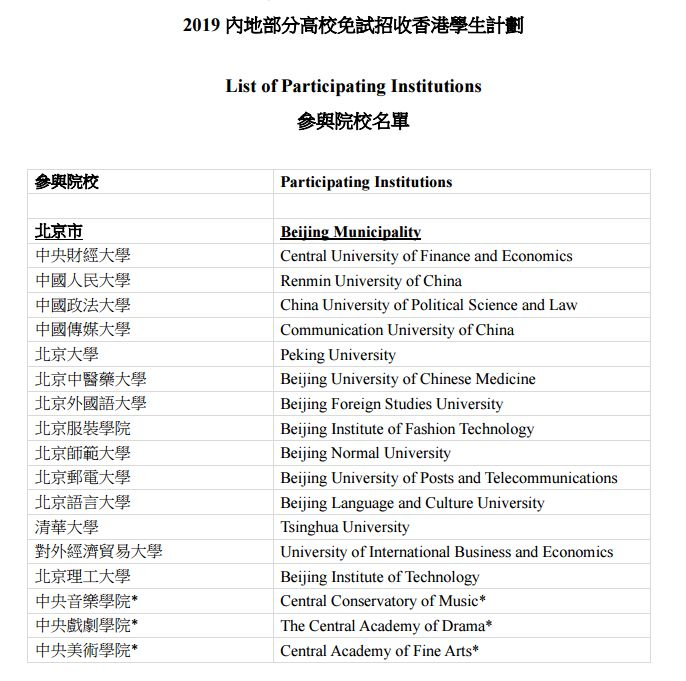 內(nèi)地高?!该庠囌猩?jì)劃」:內(nèi)地部分高等院??筛鶕?jù)考生的香港中學(xué)文憑考試成績、參考考生中學(xué)期間學(xué)習(xí)經(jīng)歷,并依據(jù)教育部核準(zhǔn)的招生計(jì)劃進(jìn)行錄取。在2019學(xué)年,內(nèi)地有109所普通高校免試招收香港學(xué)生。