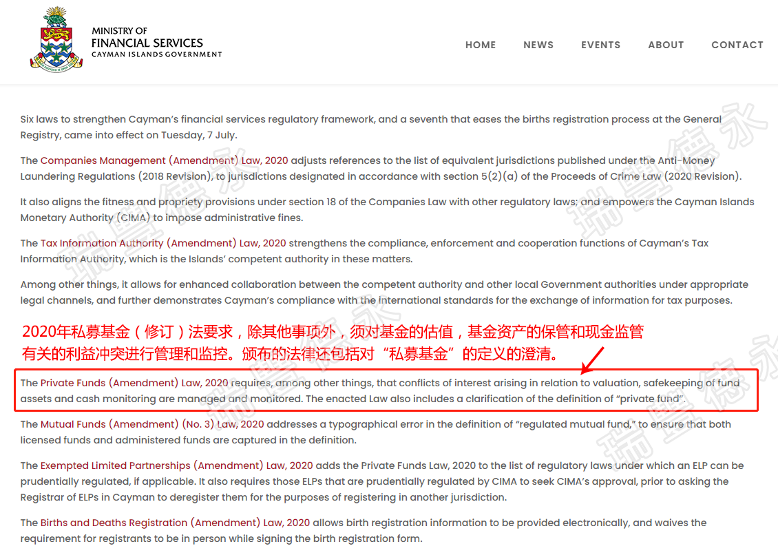 2020年2月7日,開曼群島頒布了當(dāng)日即生效的《2020年私募基金法》(Private Funds Law, 2020),新規(guī)首次將封閉式的私募基金納入開曼群島金融管理局(CIMA)的監(jiān)管之下,同時對私募基金的定義、注冊時間/內(nèi)容、相關(guān)合規(guī)事項、年度審計、年度報告、資產(chǎn)估值、資產(chǎn)保管、監(jiān)督等進(jìn)行了一些列的規(guī)范。點擊可跳轉(zhuǎn)查看