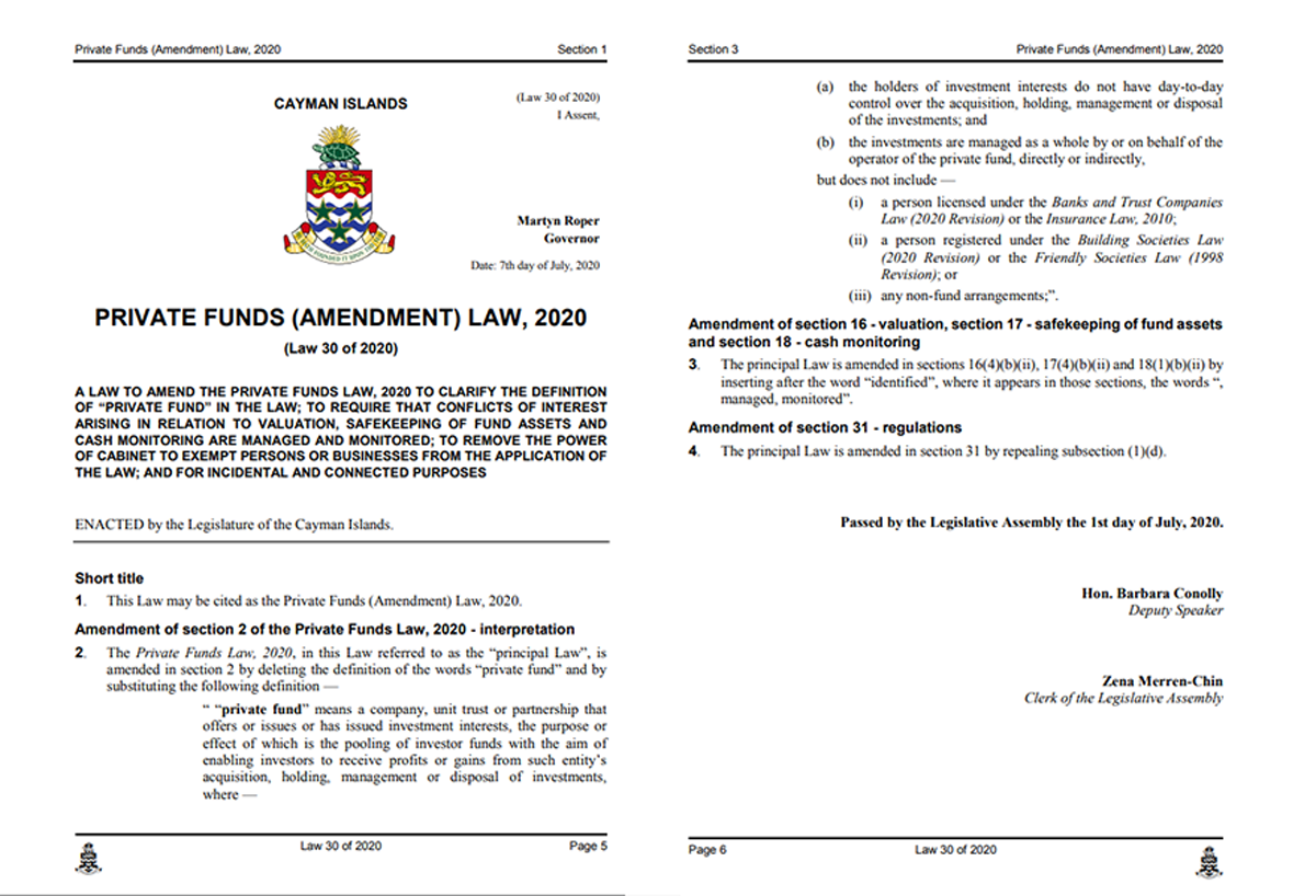 隨后,2020年7月7日,開曼再次頒布《2020年私募基金(修訂)法》(Cayman Islands Private Funds (Amendment) Law, 2020),以下簡稱“修訂案”。修訂案擴大了“私募基金”的范疇,并對估值、基金財產(chǎn)的安全托管和現(xiàn)金監(jiān)管中的利益沖突管理提出了進(jìn)一步要求,本次《修訂案》自頒布起生效。