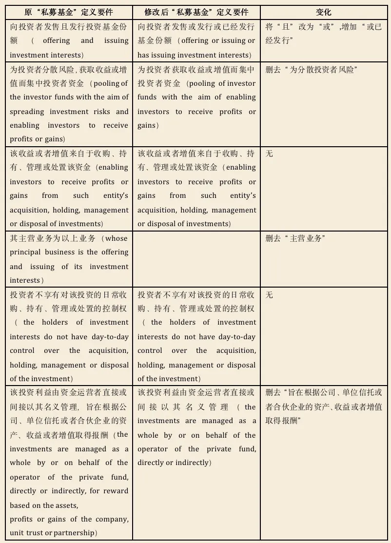 解讀:修正案中,不再要求私募基金運營者“基于該公司、單位權(quán)益或合伙的資產(chǎn)、收益或收入而獲償”,即無論管理人收取報酬與否,均不影響對“私募基金”的認(rèn)定。這一刪除,進(jìn)一步擴大了主體法的主體范圍。