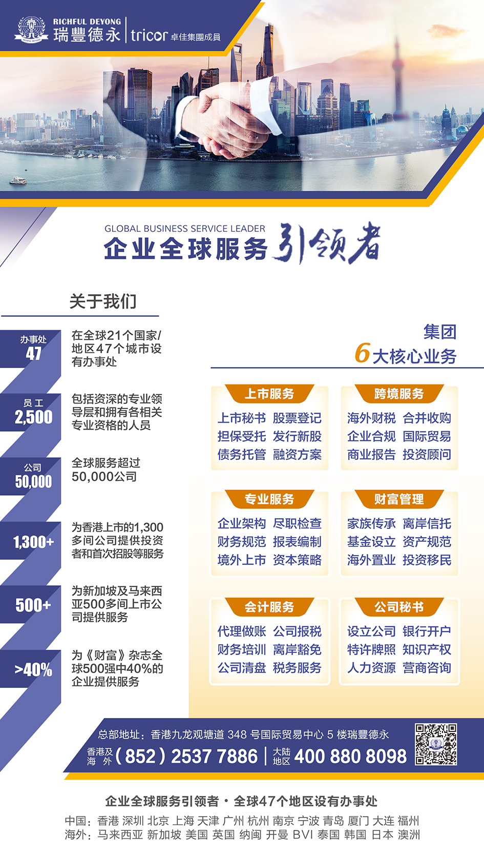 瑞豐德永為正式合法的開曼注冊代理人,在當(dāng)?shù)負(fù)碛修k公室和工作人員,可為您提供一站式服務(wù),包括實體設(shè)立、跨境投資、離岸框架設(shè)計與搭建、海外IOP、ODI投資備案等各類法定合規(guī)操作。