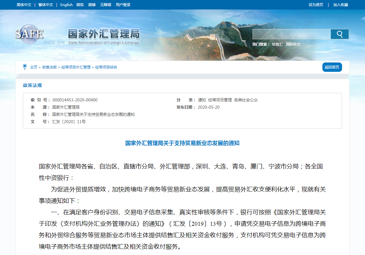 發(fā)布《關(guān)于支持貿(mào)易新業(yè)態(tài)發(fā)展的通知》(匯發(fā)〔2020〕11號(hào),以下簡(jiǎn)稱《通知》),優(yōu)化了貿(mào)易新業(yè)態(tài)外匯結(jié)算模式,擴(kuò)大賬戶收支范圍,推動(dòng)更多業(yè)務(wù)網(wǎng)上辦理,在降低市場(chǎng)主體綜合成本的同時(shí),提升跨境結(jié)算效率。