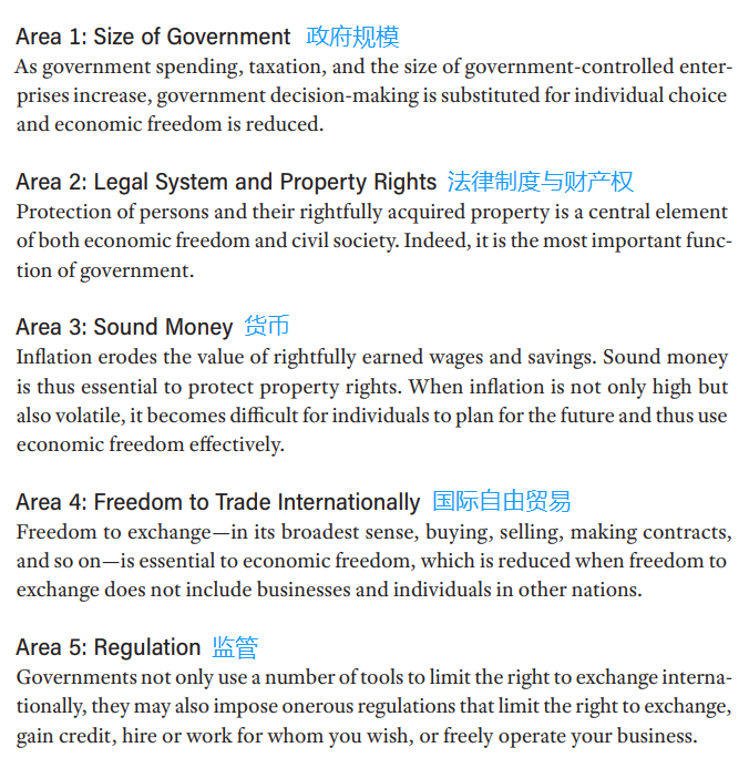 自1996年起,菲沙研究所每年均會發(fā)表世界經(jīng)濟自由度報告,最新報告中涉及5大評估標(biāo)準(zhǔn),包括政府規(guī)模、法律制度和財產(chǎn)權(quán)、貨幣、國際貿(mào)易自由、監(jiān)管。