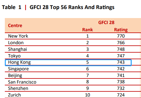 全球金融中心指數(shù)(GFCI 28)排名第五