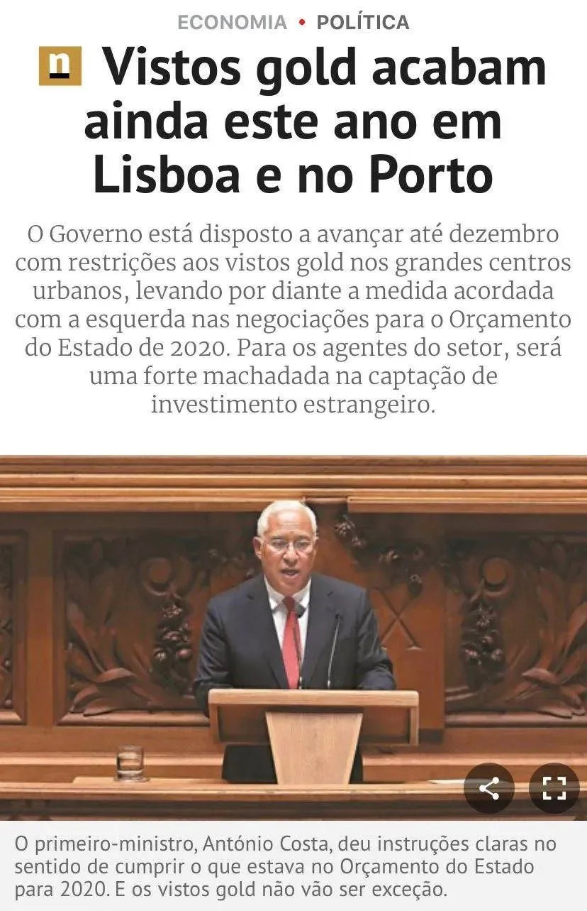 根據(jù)2020年葡萄牙國家預(yù)算法,黃金居留政策將于今年12月份在里斯本、波爾圖等大都市區(qū)中止。