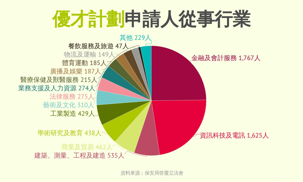 從行業(yè)細(xì)分來看,“金融及會(huì)計(jì)服務(wù)”獲分配名額最多,有1767人,其次是“資訊科技及電訊”,有1625人。這兩個(gè)行業(yè)人數(shù)占比達(dá)48%?!敖ㄖ?、測(cè)量、工程及建造”有535人,“商業(yè)及貿(mào)易”、“學(xué)術(shù)研究及教育”、“工業(yè)制造”,分別有462人、438人、429人。