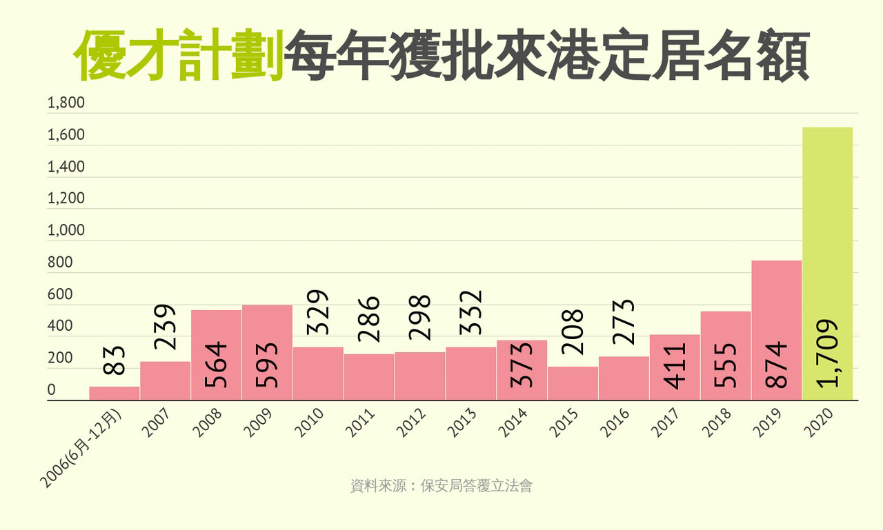 2021年1月6日,香港特區(qū)政府保安局局長(zhǎng)李家超表示,在香港優(yōu)才計(jì)劃下,2020年有1709人獲批來港定居,相比2019年的874人激增96%,屬推出14年來的新高。