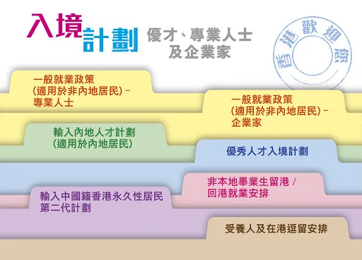 對(duì)此,香港特區(qū)政府采用多渠道吸引全球優(yōu)秀人才,目前,香港主要有三大人才輸入計(jì)劃,分別為“一般就業(yè)政策”、“優(yōu)秀人才入境計(jì)劃(優(yōu)才計(jì)劃)”及“輸入內(nèi)地人才計(jì)劃(專才計(jì)劃)”。