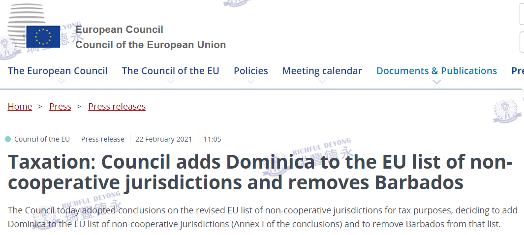 2021年2月22日,歐盟理事會(huì)在其官網(wǎng)上發(fā)布一則公告:就經(jīng)修訂的「出于稅收目的的歐盟非合作管轄區(qū)清單」(俗稱“黑名單”)通過(guò)了結(jié)論,歐盟決定將多米尼加(Dominica)加入該名單中,同時(shí)將巴巴多斯(Barbados)移出“黑名單”。