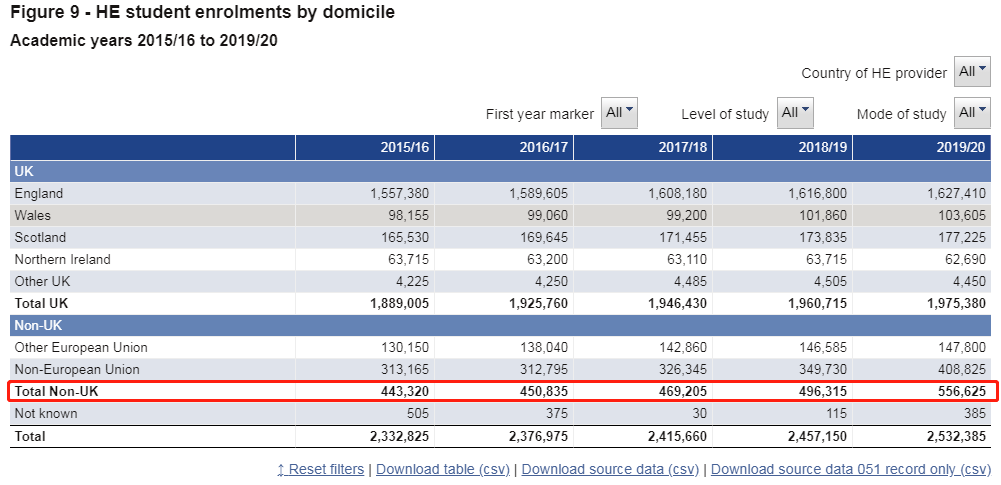據(jù)HESA數(shù)據(jù)顯示,在2019-2020學(xué)年,英國(guó)各大學(xué)留學(xué)生總數(shù)已超55萬(wàn),達(dá)到556,625人,同比上漲12%。