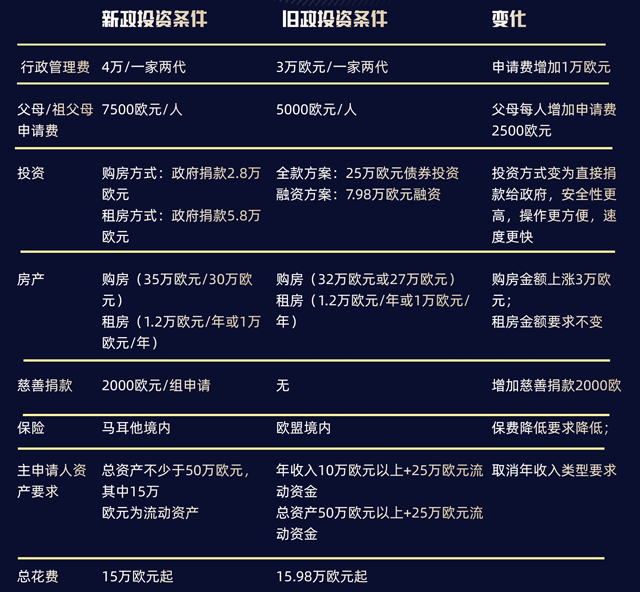 這次新政最核心的變化是投資模式,采取了“政府捐款+慈善捐款+房產(chǎn)投資”的方式,不再要求購(gòu)買(mǎi)國(guó)債,可以說(shuō)馬耳他項(xiàng)目正式邁入捐款時(shí)代。