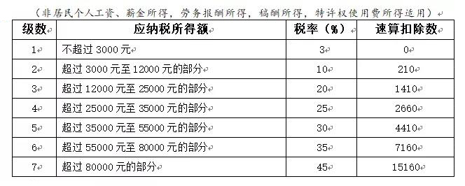 2.非居民個人取得工資、薪金所得;勞務(wù)報酬所得;稿酬所得和特許權(quán)使用費所得,依照本表按月?lián)Q算后計算應(yīng)納稅額。