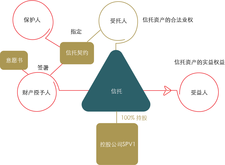 在信托的結(jié)構(gòu)圖中,首先要說明的是受托人通過100%控股的SPV1持有的信托資產(chǎn),而且財(cái)產(chǎn)授予人通過簽署信托契約,指定受托人依據(jù)信托資產(chǎn)的合法業(yè)權(quán)授予信托,然后通過意愿書所示意愿將信托資產(chǎn)的實(shí)益權(quán)益,最后才落實(shí)給受益人的,此外,保護(hù)人擔(dān)任監(jiān)管的角色確保受托人按照委托人的意愿管理信托。如下圖所示: