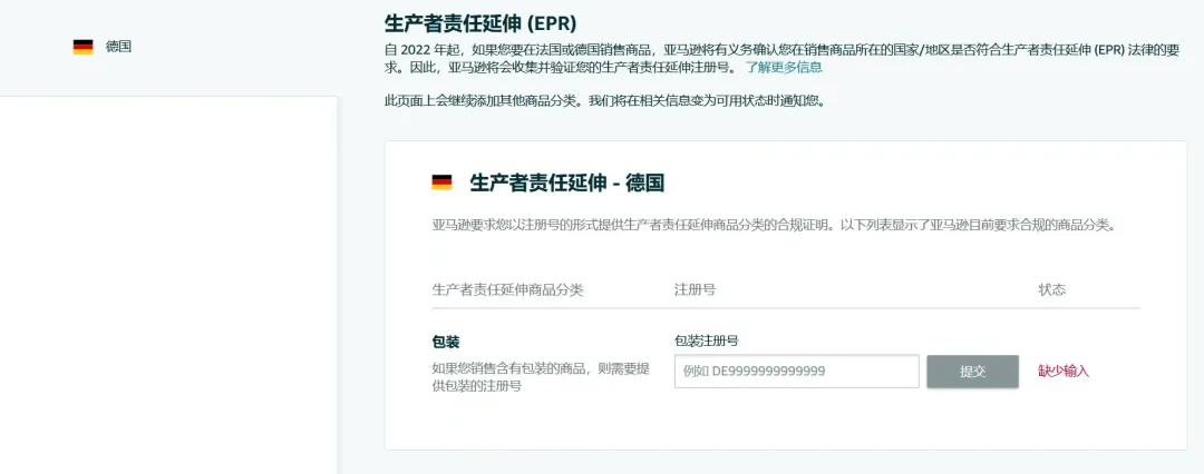 生產(chǎn)者責(zé)任延伸(EPR)是一項(xiàng)環(huán)境政策,要求生產(chǎn)者對(duì)其在市場上所推出商品的整個(gè)生命周期負(fù)責(zé),即從商品設(shè)計(jì)開始到商品生命周期結(jié)束(包括廢棄物收集和處理)。自 2022 年起,如果您要在法國/德國銷售商品,亞馬遜將有義務(wù)確認(rèn)您在銷售商品所在的國家/地區(qū)是否符合生產(chǎn)者責(zé)任延伸(EPR)的要求。因此,亞馬遜將會(huì)收集并驗(yàn)證您的 EPR 注冊(cè)號(hào)。