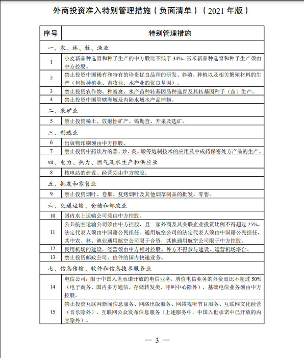 《外商投資準入特別管理措施(負面清單)(2021年版)》已經(jīng)在2021年9月18日國家發(fā)展和改革委員會第18次委務會議審議通過和商務部審簽,并經(jīng)黨中央、國務院同意,自2022年1月1日起施行。