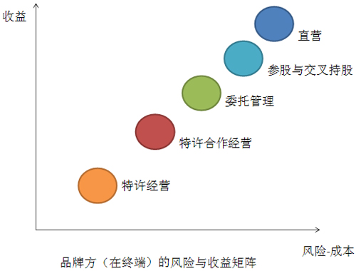 在這張圖里,我們大致可以看出品牌公司在對(duì)終端五種不同的方式控制路徑下,他們的風(fēng)險(xiǎn)-成本與收益的組合。連鎖公司經(jīng)營(yíng)的初期往往會(huì)注重終端的數(shù)量而非質(zhì)量,所以會(huì)選擇較小的收益與較低的風(fēng)險(xiǎn)-成本,當(dāng)終端“圈地”完成之后,重點(diǎn)則轉(zhuǎn)入單店的贏利能力和單店帶給公司的營(yíng)業(yè)收入。我們說沒有一種愛情是最好的,不同的階段可能會(huì)欣賞不同的戀愛方式,品牌公司也是如此,最重要的還是要根據(jù)自己自身資源與能力,在公司戰(zhàn)略的指引下選擇一種或是幾種的連鎖組合。