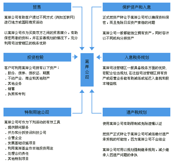 無論客戶以個人還是企業(yè)的身份均可以利用離岸公司作多種用途,其中最普遍的用途和好處包括: