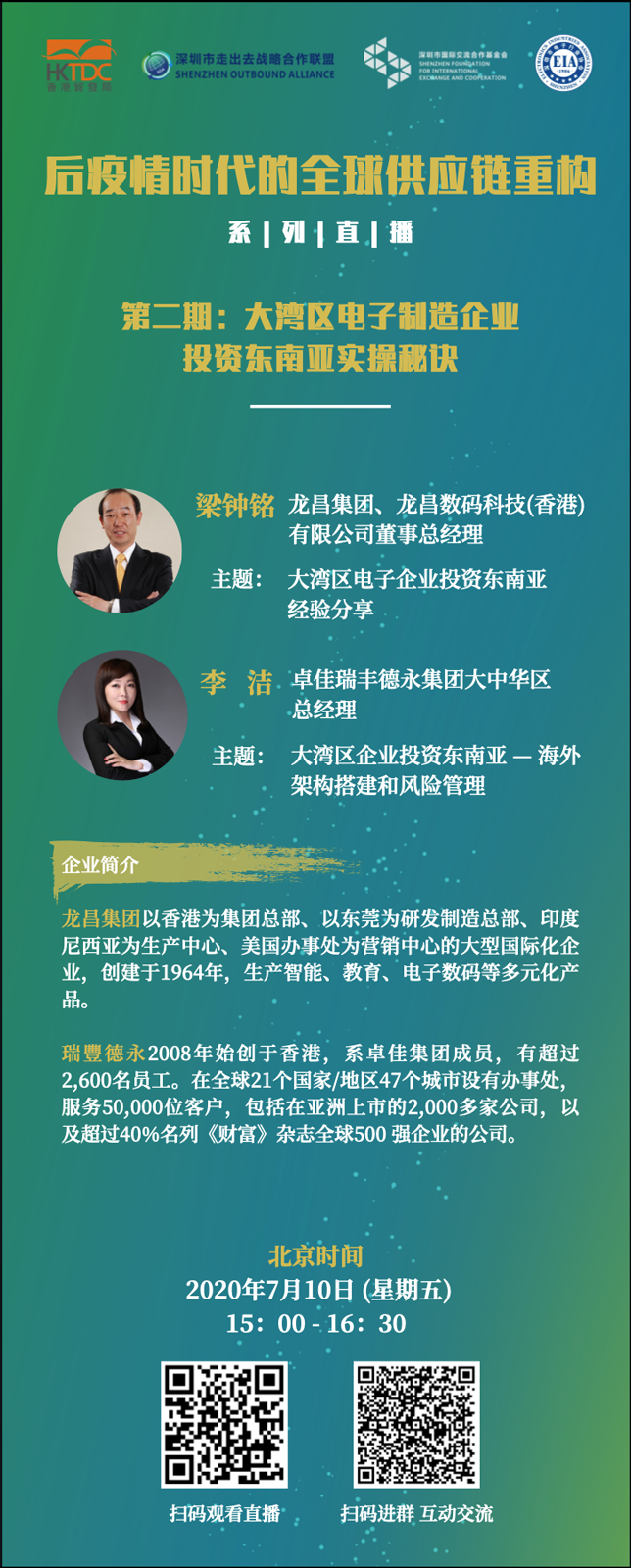 第二期直播將聚焦“大灣區(qū)電子制造企業(yè)投資東南亞實操秘笈”,將更進一步深入探討,活動邀請了在大灣區(qū)和東南亞都有投資設(shè)廠的電子企業(yè),分享他們在東南亞投資的經(jīng)驗和心得體會,并邀請權(quán)威專業(yè)機構(gòu)從第三方角度進行點評,為大灣區(qū)電子企業(yè)在東南亞投資設(shè)廠提出建議。