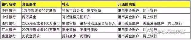 中國銀行,中信銀行,渣打銀行,匯豐銀行,富邦銀行(沒有資金要求,只限內(nèi)部預(yù)約)。其中中信銀行可以在國內(nèi)指定分行可以見證開戶,富通銀行對資金沒有要求,但是只限內(nèi)部提前預(yù)約,具體區(qū)別整體如下: