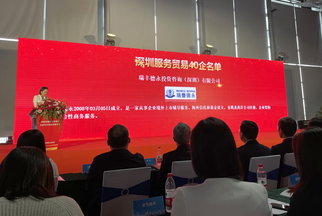 12月9日,深圳市商務局主辦,深圳市服務貿(mào)易協(xié)會承辦的“深圳特區(qū)成立40周年服務貿(mào)易40企表彰大會”在深圳會展中心順利展開。瑞豐德永作為服務貿(mào)易示范項目受邀出席本次大會并獲表彰。