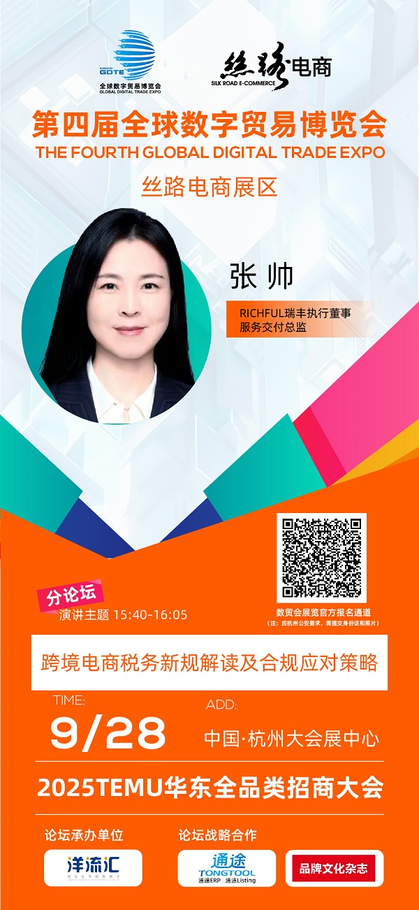 展會期間(9月28日),RICHFUL瑞豐執(zhí)行董事、服務(wù)交付總監(jiān)張帥女士將出席2025TEMU華東全品類招商大會,發(fā)表《電商新規(guī)解讀及跨境電商稅務(wù)全球稅務(wù)考量》重磅演講。屆時將權(quán)威解讀2025年15號、17號公告最新政策,深入剖析四大合規(guī)模式的適用場景與落地策略,幫助企業(yè)應(yīng)對全鏈條穿透式監(jiān)管新挑戰(zhàn)。