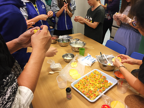 瑞豐義工團都馬上動手,聽從導(dǎo)師指示分工,先包燒賣和臘腸卷。