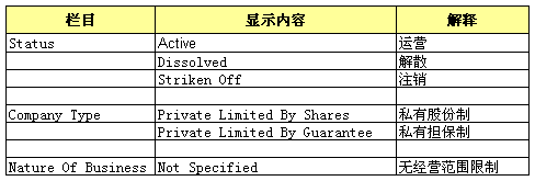 從這個頁面上您可以看到公司的名稱和注冊地址(Name & Registered Office), 公司的注冊號碼(Company No.),公司狀態(tài)(Status),成立時間(Date of Incorporation),公司類型(Company Type),公司營業(yè)性質(Nature of Business),報稅日期(Next Accounts Due),年審日期(Next Return Due)。