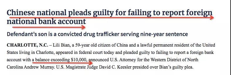 2019年7月8日,住在北卡夏洛特市的59歲中國公民Lili,出現(xiàn)在聯(lián)邦法庭認(rèn)罪。她持有美國綠卡,承認(rèn)在中國境內(nèi)某金融機(jī)構(gòu),有超過1萬美元的賬戶,且未向財政部上報外國銀行和金融帳戶表格(Foreign Bank and Financial Account Form,F(xiàn)BAR),繼而遭到聯(lián)邦起訴。