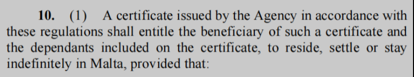 法案中明確提到身份局簽發(fā)的身份紙可以讓申請(qǐng)人及其附屬申請(qǐng)人無(wú)限期地在馬耳他居住、定居及生活。身份局通過(guò)法案的形式進(jìn)一步明確了馬耳他身份的永居屬性。