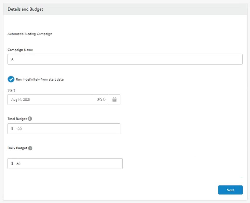 第 4 步:如圖4所示,輸入活動(dòng)名稱并設(shè)置開始日期。你可以在此處選擇廣告的總預(yù)算以及每日預(yù)算??傤A(yù)算必須至少為 100 美元,每日預(yù)算必須至少為 50 美元。