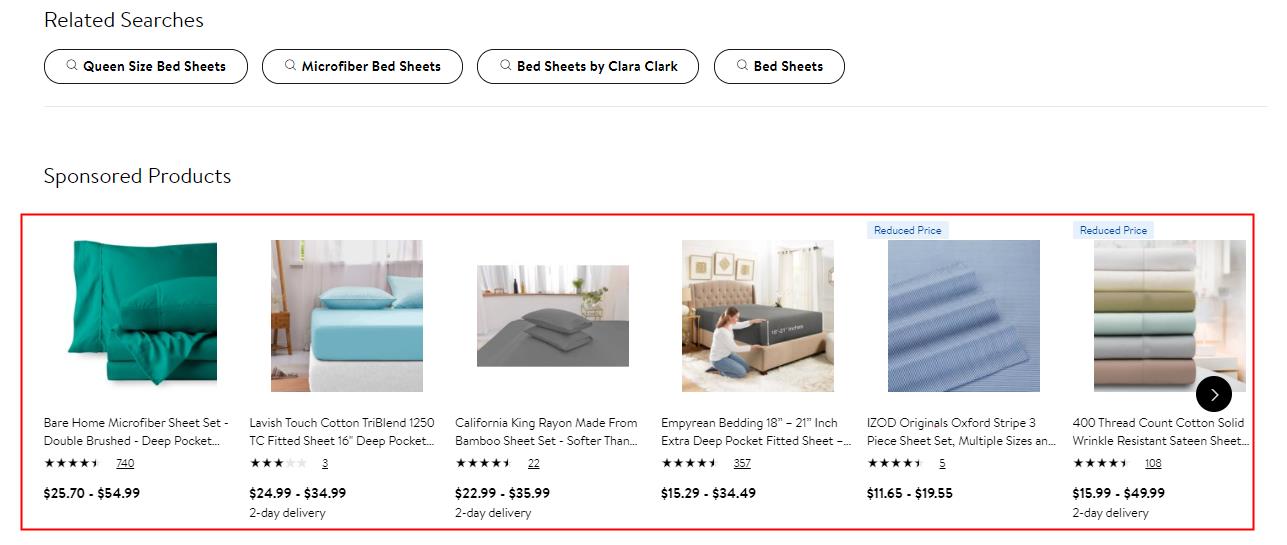 如圖10所示,贊助商廣告可以出現(xiàn)在 Walmart.com 的幾個(gè)不同位置。它們通常出現(xiàn)在搜索結(jié)果頁(yè)面中,產(chǎn)品購(gòu)買框下方,或者出現(xiàn)在搜索頁(yè)面、產(chǎn)品頁(yè)面上的產(chǎn)品輪播中。