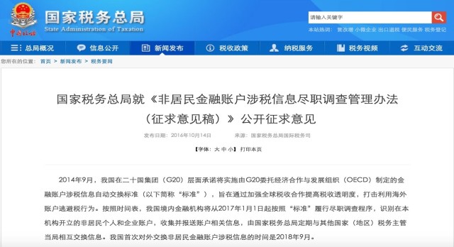 國家稅務(wù)總局于 2016 年 10 月 14 日在官方網(wǎng)站上就非居民金融賬戶涉稅信息盡職調(diào)查管理辦法(征求意見稿)》公開征求意見。中國將于 2017 年 1 月 1 日實施新的賬戶開戶程序,首次對外交換非居民金融賬戶涉稅信息的時間是 2018 年 9 月。