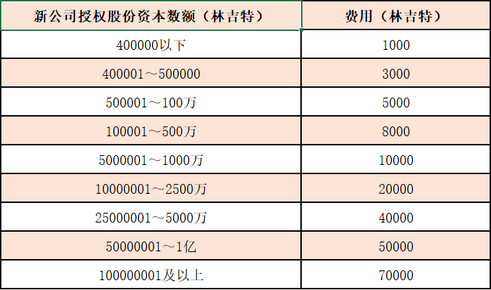 公司設(shè)立的費(fèi)用將根據(jù)新公司擬授權(quán)的不同股份資本數(shù)量按照下述表格而收取固定費(fèi)用: