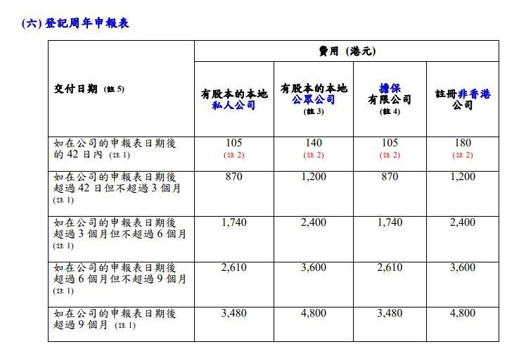 6.不年審的后果主要有兩方面,一方面是會(huì)產(chǎn)生罰款,商業(yè)登記證更新的罰款是300港元每年,寬限期是30天,周年申報(bào)表的罰款是870港幣每個(gè)季度,可參照下圖。如果持續(xù)欠費(fèi)會(huì)收到法院傳票,如果還是拒絕上庭與處理將會(huì)面臨更多的罰款以及公司強(qiáng)制被除冊(cè),留下不良記錄,對(duì)以后再次擔(dān)任公司股東董事還有銀行開戶以及香港出入境都會(huì)有影響。