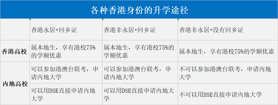 不管是永居還是非永居,關(guān)鍵點在于”回鄉(xiāng)證"。有回鄉(xiāng)證,就可以DSE和華僑生聯(lián)考的形式入讀內(nèi)地大學(xué)。無論是永居還非永居,只要有回鄉(xiāng)證就可以。無論有沒有回鄉(xiāng)證,只要有香港身份都屬于本地生,可以享受75%的學(xué)額優(yōu)惠。不過,無論是那種情況,要想DSE考試優(yōu)勢最大化,都需要持有香港身份。